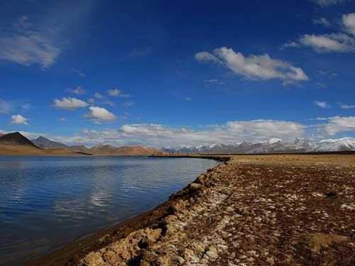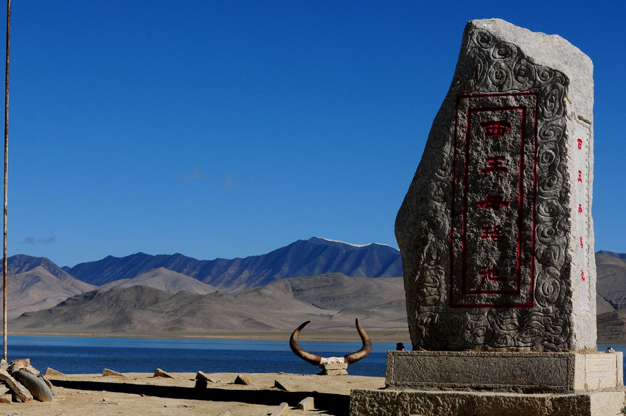 西王母瑶池原名黑海,距格尔木市区250 km,海拔4300 m,东西长约12000 m,南北宽约5000 m,湖水最深度达107 m,面积约38.74km2。它是一座天然高原湖泊,属构造断陷湖,湖水主要由冰雪融水通过地下径流补给,水体中泥沙含量低,形成透明度很高的清澈湖水,成为昆仑河的源头。在湖上游的西岸可见古湖岸线,湖的西岸、南岸可见大面积出露地表的湖相沉积物,表明湖的面积在逐渐缩小。