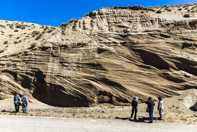 该交错层理为风成板状交错层理,出露范围长约30 m,高约10 m,地质时代为距今约12.6万年~1.1万年的第四系晚更新世。交错层理规模大,层系厚度最厚可达2.5m,构成层系的细层倾角较大,一般为22~25°,最大可达30°,细层倾向变化较大,指示了不同的古代风向。在显微镜下观察,可见沙粒“沙漠漆”等现象,表明该交错层理是风成而非流水成因。砂层顶部被约20cm厚的河流冲积物覆盖,在层间可见清晰的波痕,波长为15cm,波高为2cm,说明后期沙丘又被水流淹没。风成交错层理的出现,揭示了该地区冰期-间冰期交替形成的局部古气候变化。