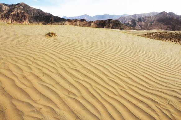 温泉沟沙丘是位于温泉沟口的小型沙丘,分布面积约1km²,东西延伸约860 m,是由全新世(距今约1万年以来)风力作用下的沙粒堆积而成。该沙丘规模较小,表面基本无植被发育,其形态时常改变,时而变为饼状,时而变为盾状、新月状,但沙丘的地理位置基本不变,属于半固定沙丘。沙粒粒度均匀,磨圆极好,在阳光下呈耀眼的金黄,映衬着远处青黑色的山峰显得极为灵动。
