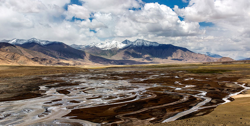 辫状河多发育于山前倾斜平原及水流较小而河谷十分宽广的河段,多河道、多次分叉和汇聚构成辫状。野牛沟辫状河河道宽而浅,河道最宽处达570 m,弯曲度小,河流坡降大,河道不固定,迁移迅速,故又称为“游荡性河”。河水蜿蜒分叉犹如辫子穿插交错,是典型的辫状河。河中的沙洲形成了色调深浅不一的各色小岛,使得整片河段呈现出一派生机勃勃的景象。