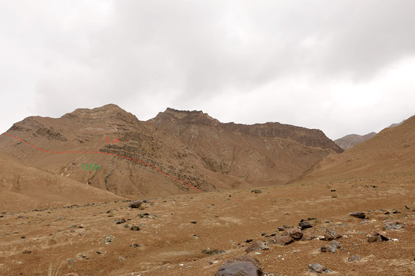 该点为点北的奥陶纪(4.8-4.4亿年前)纳赤台群浅灰绿色千枚岩与点南侧为三叠纪洪水川组(2.5-2.03亿年前)灰绿色块状砂砾岩不整合接触。