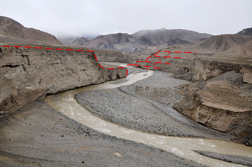 该处发育V级河流阶地。其中 Ⅲ-V级阶地出露宽度4-6 m,Ⅰ-Ⅱ级阶地出露宽度1.5-3 m。物质成分为砾石、砂、粘土,其中砾石50%以上,砾径约0.5-2 m,磨圆较好,分选中等;砂40%,粘土约10%,胶结程度较好。5级阶地代表了本区域至少发生过5次间歇性抬升。