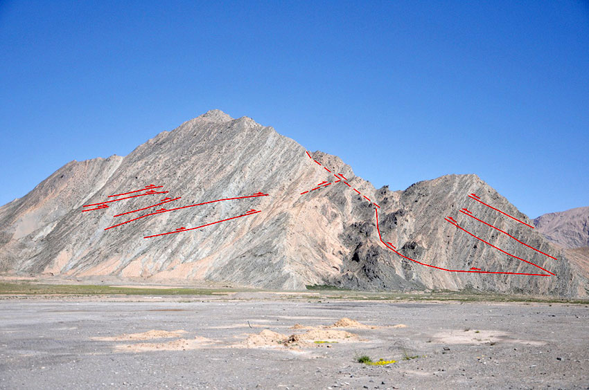 断裂带经过该点,山体东西两侧分布两组断层,每组断层各有5条左右,各断层的上盘(断层面以上的部分)依次相对上冲,呈叠瓦状。两组断层中间颜色较深的岩石受挤压而较为破碎。