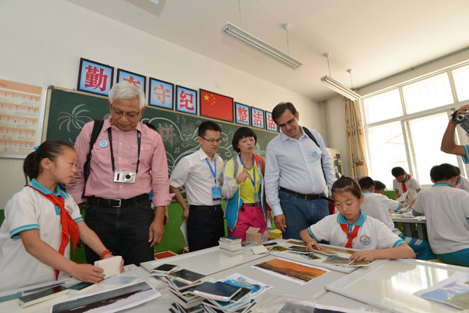 会后,联合国专家一行来到昆仑山国家地质公园博物馆参观,昆仑山国家地质公园管理局外宣科科长李毅和吴瑾对博物馆的建设内容和理念进行了详细的解说,两位专家对博物馆的布展给予认同和称赞。同日下午,联合国专家一行又来到地质科普小学---江源路小学,对学生们的暑期夏列营活动进行了简短的参观,在学校期间,孩子们的活动多种多样,有开展地质科普学习的小课堂,有开展世界地质公园拼图游戏,有开展地质科普绘画的活动,还有昆仑山地质旅游介绍的导引。学生们丰富多彩的科普活动让尼古拉斯•邹若思教授、库穆教授感到了浓厚的科普韵味和愉悦的活动氛围,两位教授对学校开展的一些列科普活动表示鼓励和支持,同时希望这样的活动能够经常开展,让更多的孩子们了解地质公园科普知识和文化。随后两位教授一行来到了唐镇长江村牧民家进行走访,牧民自己制作的手工艺品让两位教授感到十分的震惊,也表现出了浓厚的兴趣,并和当地牧民进行了亲切交流。