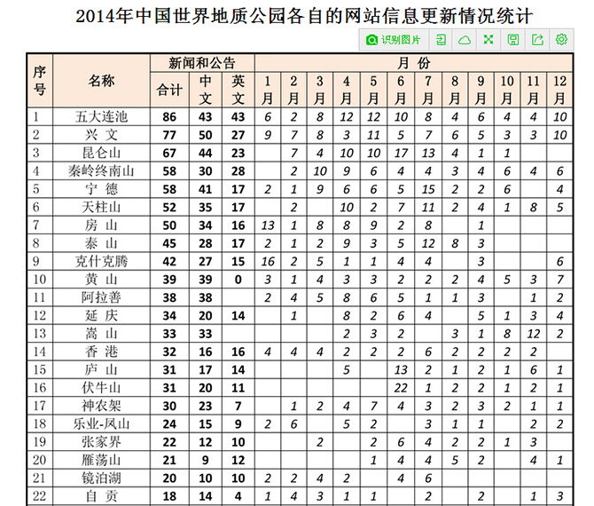 近日在国家地质公园网络中心、世界地质公园网络办公室于2015年1月22日公布的2014年中国世界地质公园各自的网站信息更新情况统计中,昆仑山世界地质公园2014年信息发布量排名第三,其中中文信息44个,英文信息23个,通过这些信息的发布,昆仑山世界地质公园让更多的网络读者们,及时了解到昆仑山世界地质公园的发展和活动,增进了公园和公众之间的距离。