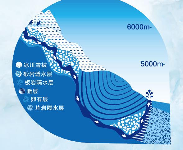 复杂的东西大滩以及玉珠峰附近的断层组给补给的地下水提供了径流通道,冰川融化后沿岩石构造裂隙渗入地下,在重力作用下沿构造裂隙通道运移,遇断层阻水溢出地表,通过良好的地层条件的过滤,最终形成珍贵的雪山泉水。泉水循环周期大于20年。水温2~3℃,水量均衡,富含锶,钙、钾、碳酸氢根等多种人体所需微量元素。