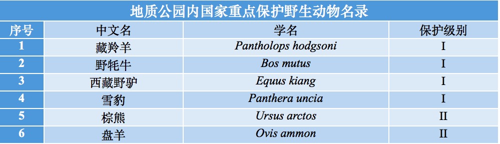 公园地区生物区系种类少,但青藏高原特有种比例大,且种群数量大,藏羚羊、野牦牛、黄羊、野驴等均属于珍稀动物。