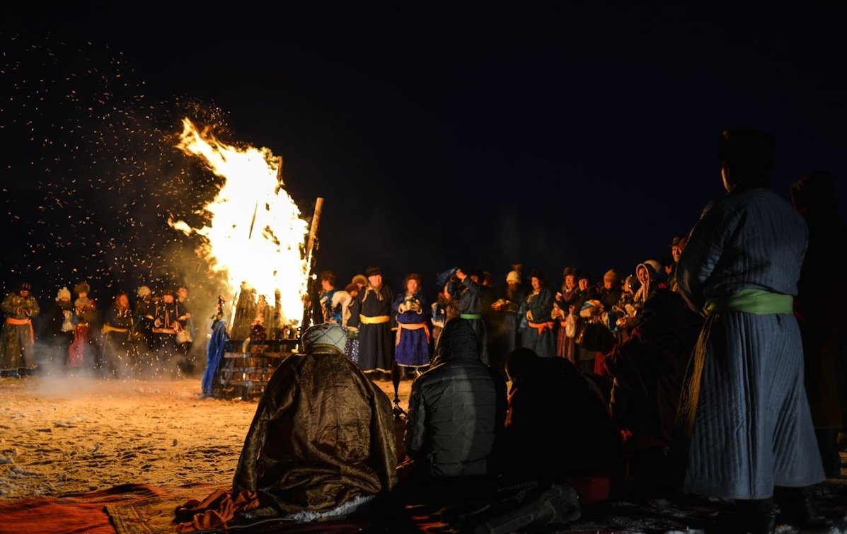 到了晚上上灯时辰,在灶膛内填入红柳根、香柏片,上围干牛粪,将灶火点燃。“祭火”时,男主人双手托起煮好的羊胸叉放入火中,享用“祭火”的“口福”。全家人对着火焰向火神祈祷。